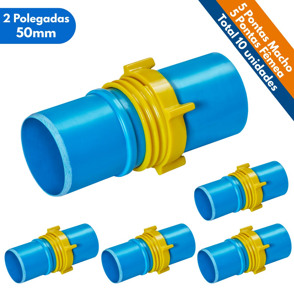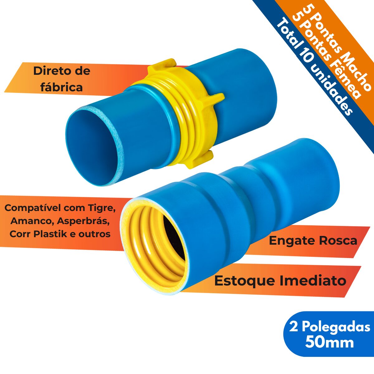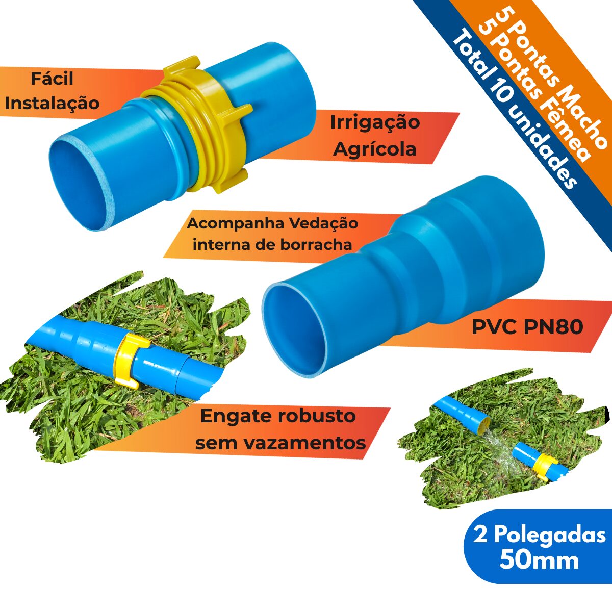 Kit 10un Ponta Femea e Macho 2 Polegadas Tubo 50mm PVC Irrigação