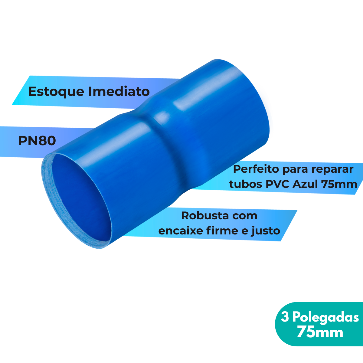 📢 O objetivo desta luva soldável é reparar tubos da linha de PVC Azul quebrados, ambos os lados desta luva contém bolsa para encaixe do tubo.