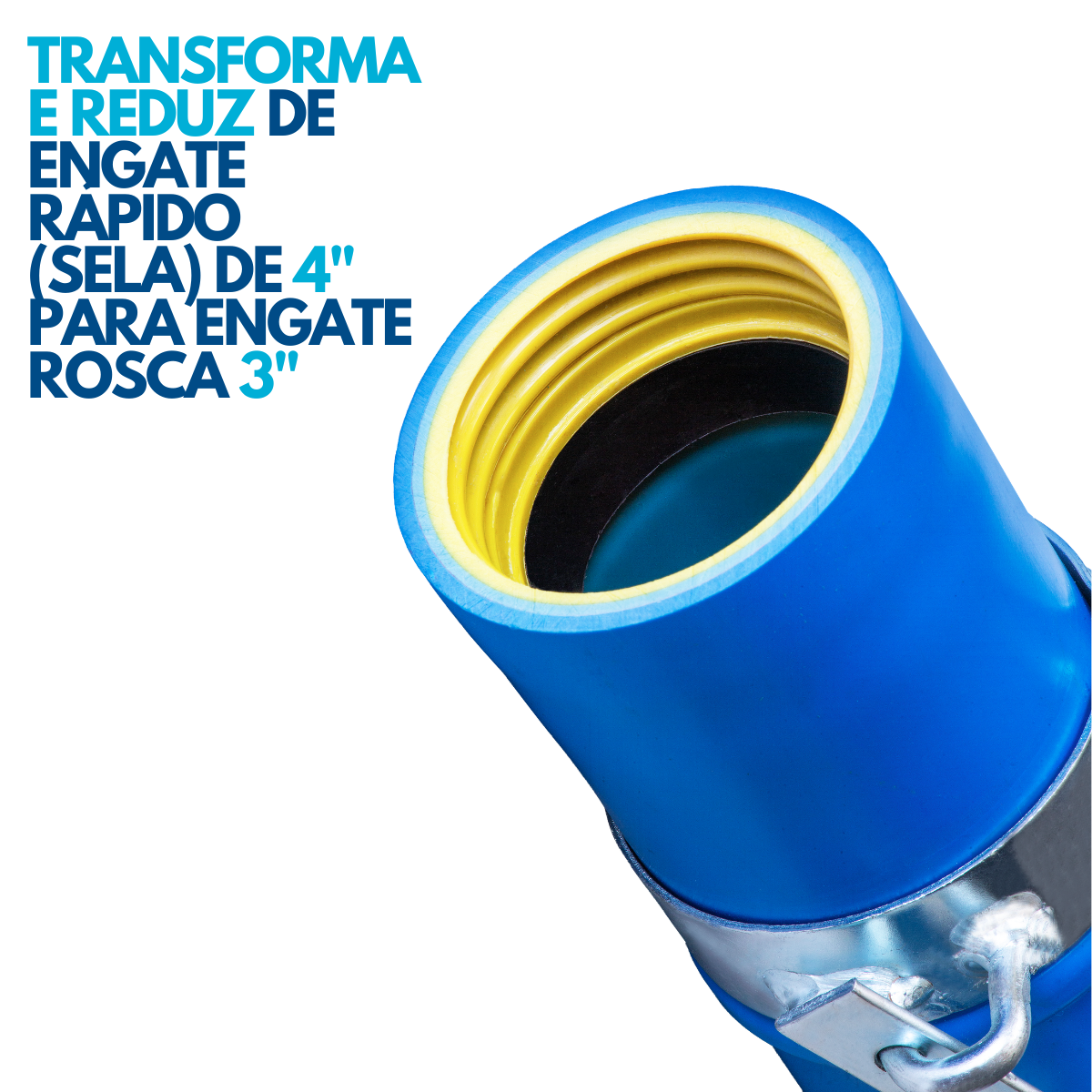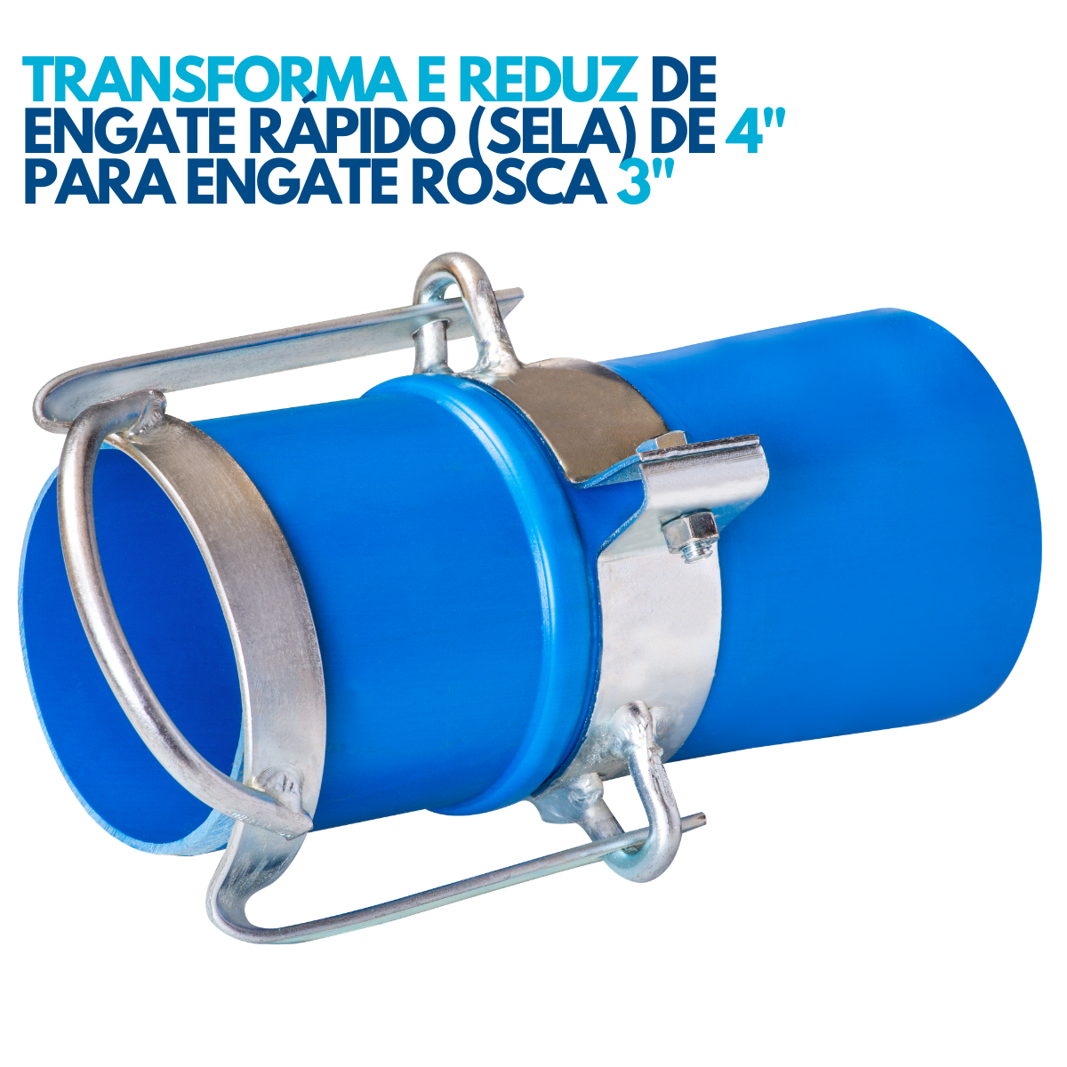 • O objetivo desta conexão é reduzir e transformar a tubulação de 4″ de engate sela/engate rápido em 3″ de engate rosca (EP).